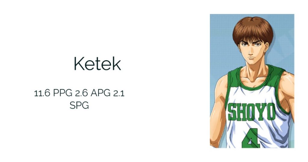 Ketek man of fire, begitu para pemain menyebut nya, Ketek dengan Fujima nya benar-benar menjadi heart and soul dari team Tobe, artinya jika Ketek bermain bagus maka team Tobe pasti akan selalu menang dan jika Ketek berhasil di redam maka Tobe pun akan sulit meraih kemenangan. Pemain yang memiliki role sebagai main offense creator juga bisa berperan penting dari hal denfense terlihat dari stats nya yang ada di segala posisi.